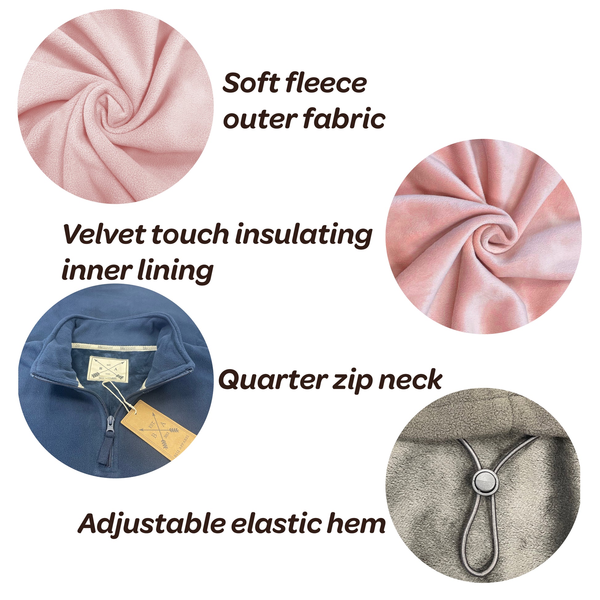 Quarter Zip closure with stand-up collar, drawstring elasticated hem around the bottom, allowing for a comfortable and close fit, keeping the wind out effectively.